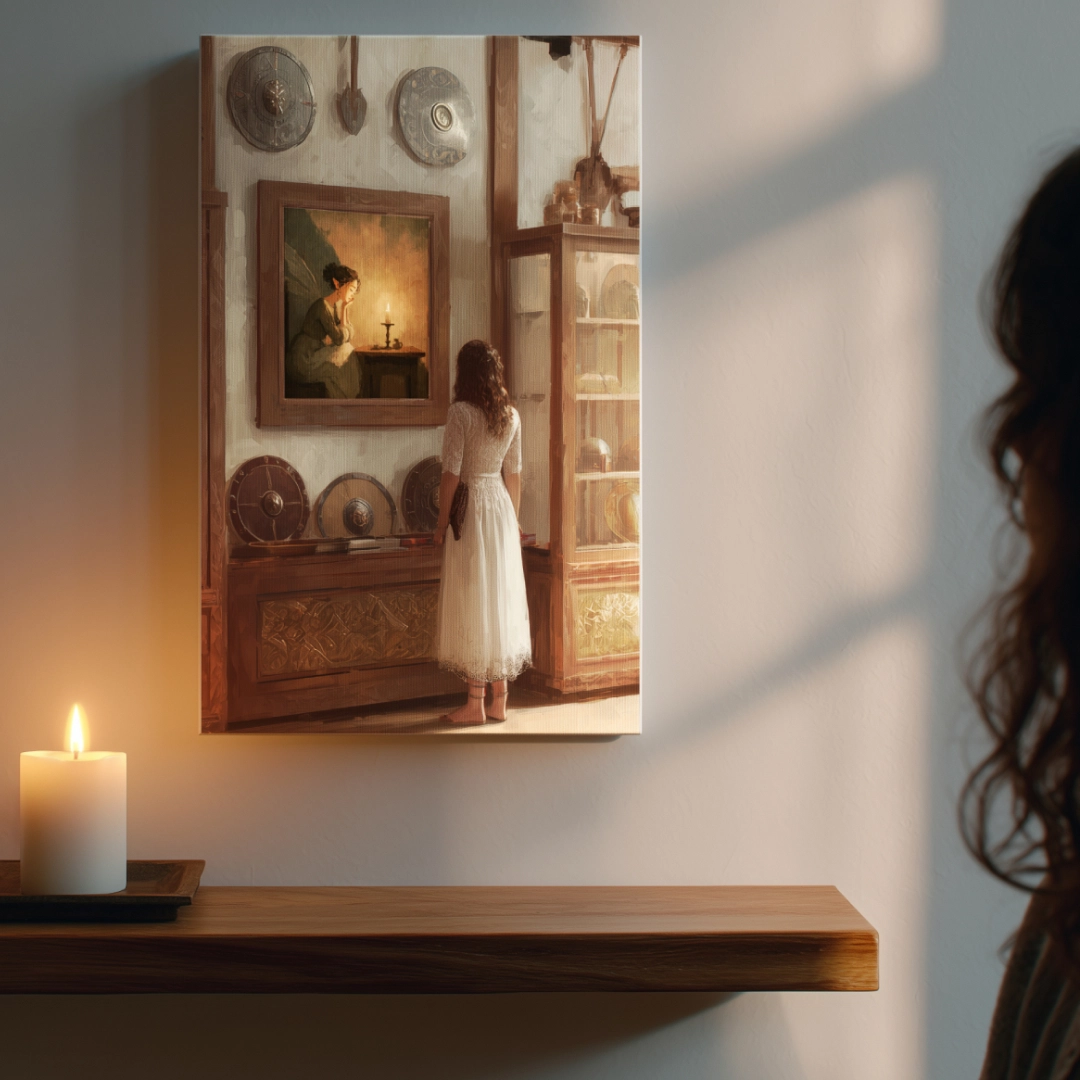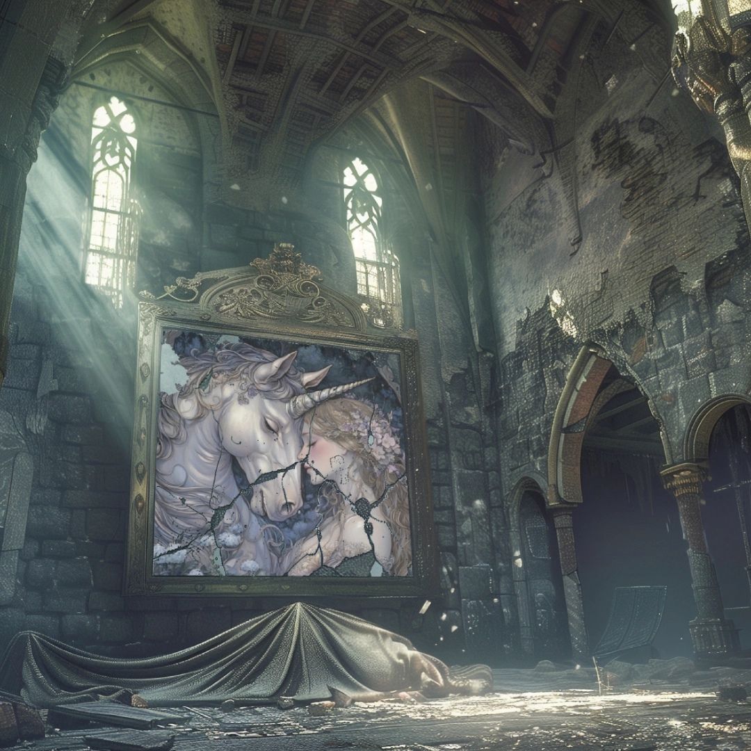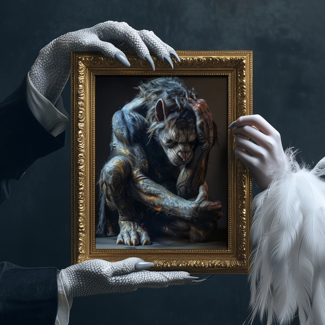 I approached my later collections in a different way. Toward the end of 2024, I discovered the creative potential of AI — the possibility of creating works together that differ entirely from my own drawing style. For these pieces, I provide the compositional idea, the intended style, and the color palette, while it (most often Midjourney) contributes the technical knowledge and visual imagination needed for the final depiction.
